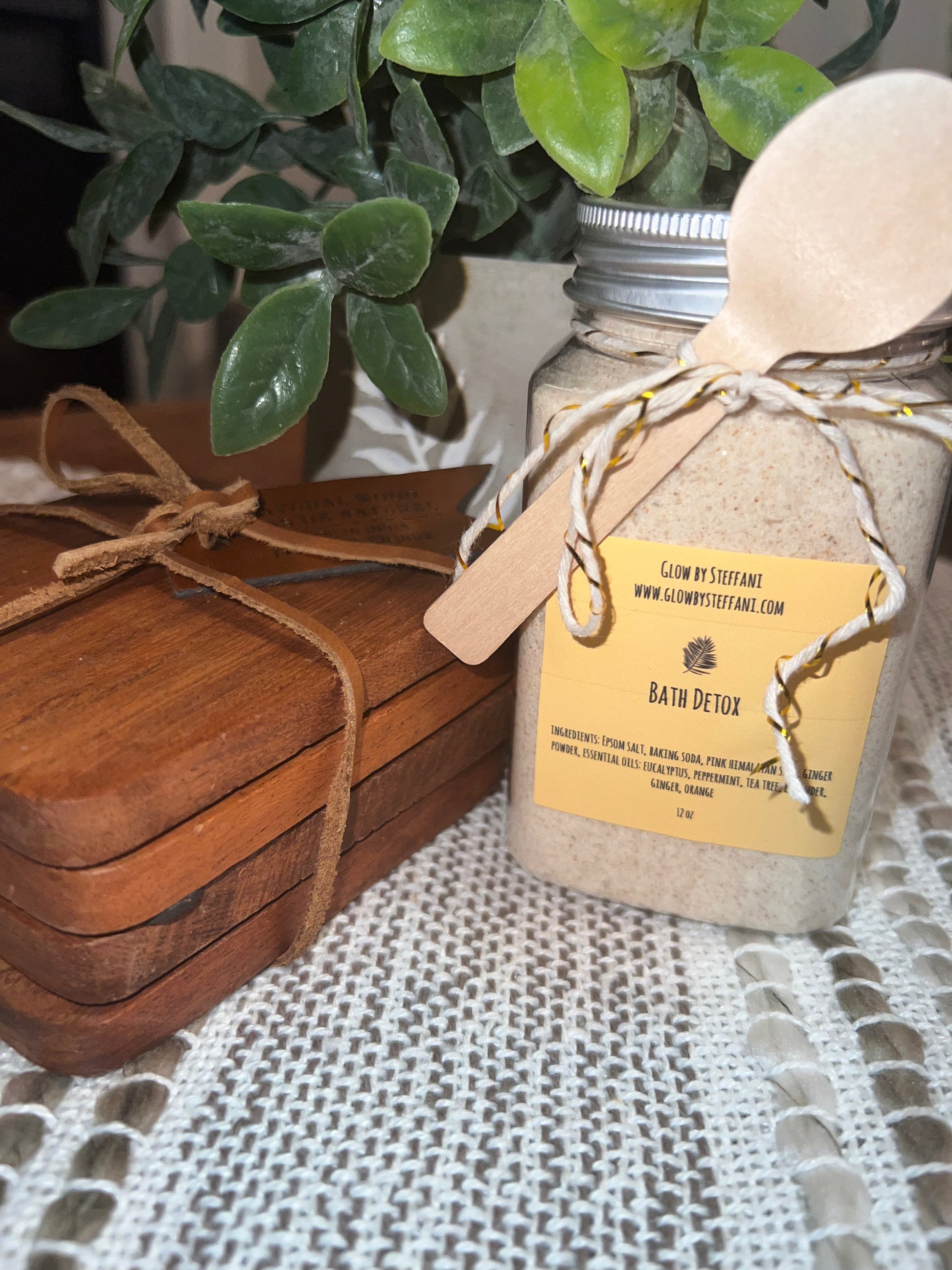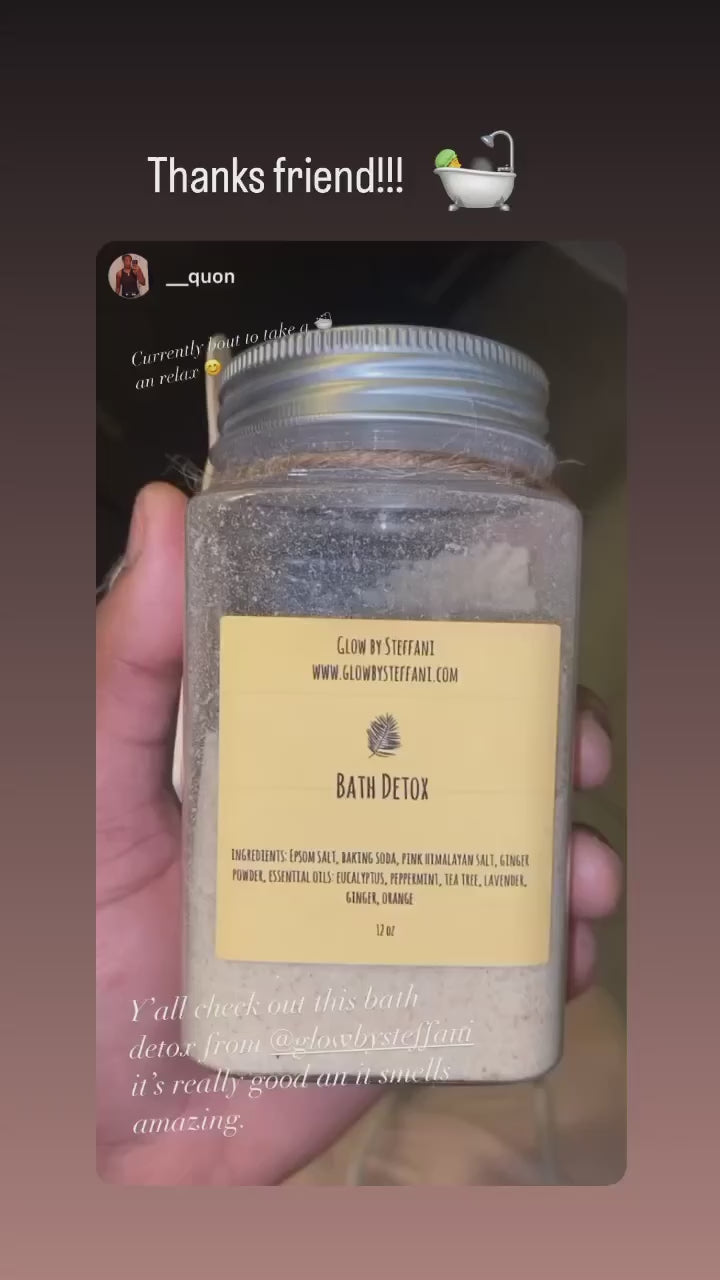 Ingredients: Epsom salt (magnesium sulfate), baking soda, pink himalayan salt, ground ginger, essential oils: eucalyptus, peppermint, tea tree, lavender, ginger, orange